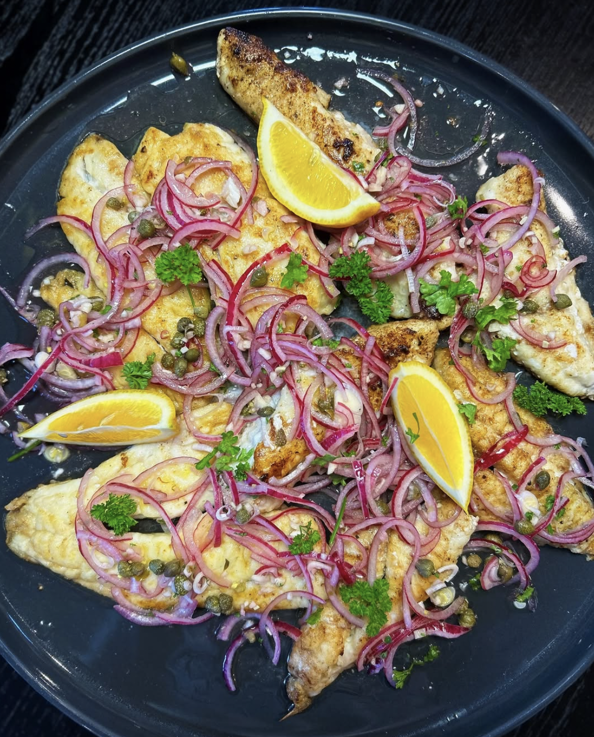 300 grams of firm white fish fillets coated in flour and lemon pepper seasoning then pan-fry in butter until golden.