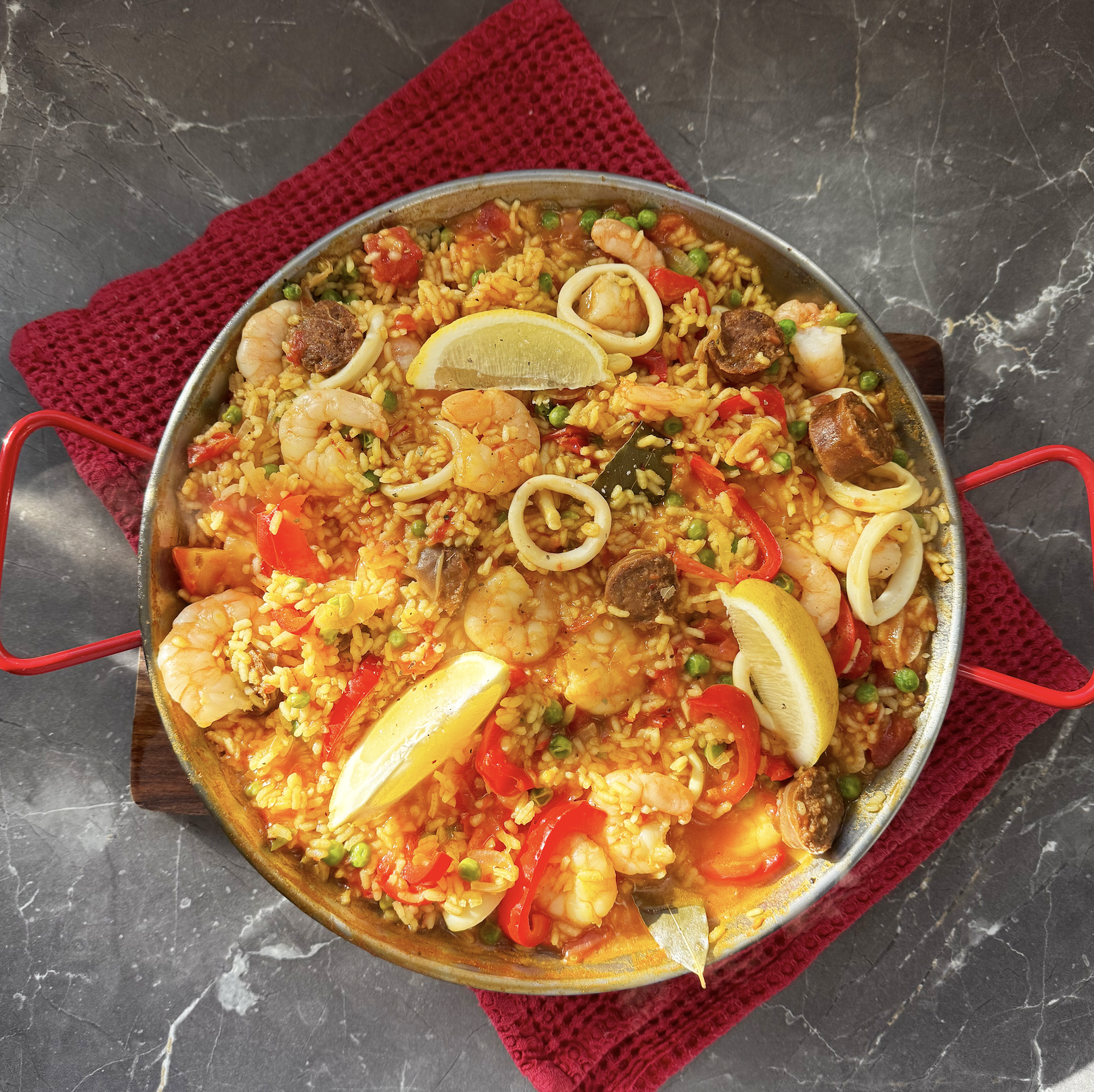 Nestle in prawns, cooked chorizo, and squid rings. Sprinkle peas evenly across. Cook for another 10–15 minutes until rice is tender and liquid is absorbed. Avoid stirring to develop a crispy bottom crust (the socarrat).Finish with Citrus: